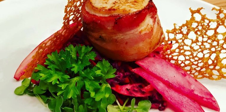 Hähnchenbrust im Baconmantel auf Himmel und Erde