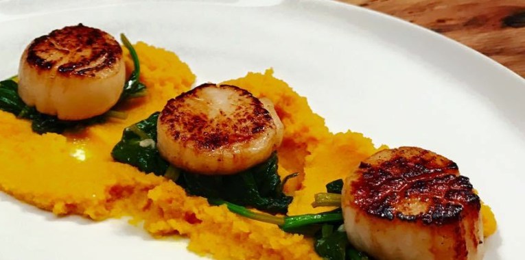 Jakobsmuscheln an Möhrenpüree und Knoblauchspinat