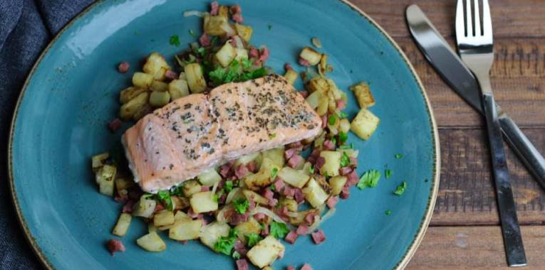 Sellerie ist unglaublich vielseitig. Wenn man abends etwas Deftiges möchte, aber die Kohlenhydrate minimieren will, eignen sich dieser Bratsellerie hervorragend. Statt Lachs kann man natürlich jedes andere Fleisch dazu reichen.