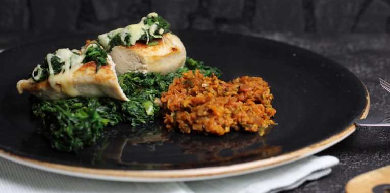 Hühnchen an Zucchinireis und Spinat