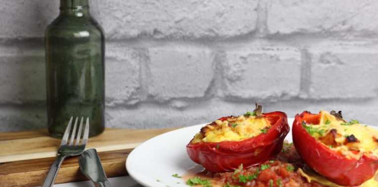 Gefüllte Paprika gibt es als Gerichte in Hülle und Fülle. Ich hatte einige Zutaten über und habe mal schnell ein kleines Gericht darauf gezaubert. Vegetarier nehmen statt des Hühnchens Feta und würfeln diesen.