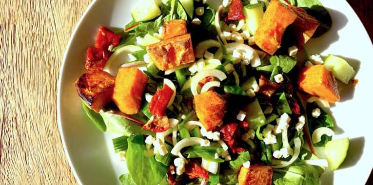 Sonne, Feierabend, was Einfaches auf den Teller bitte. Hier ein knackiger leckerer Salat. Ohne Feta sogar vegan.
