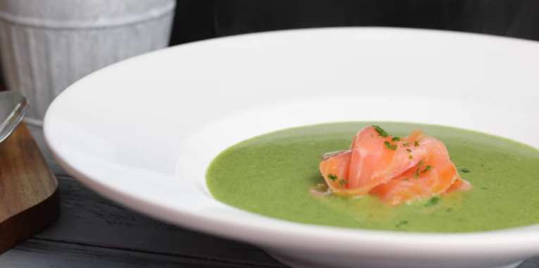 4. Die Suppe pürieren und die Sahne-Eigelb Mischung einrühren. Mit Salz und Pfeffer abschmecken. Die beiden Prisen dazugeben und anrichten.