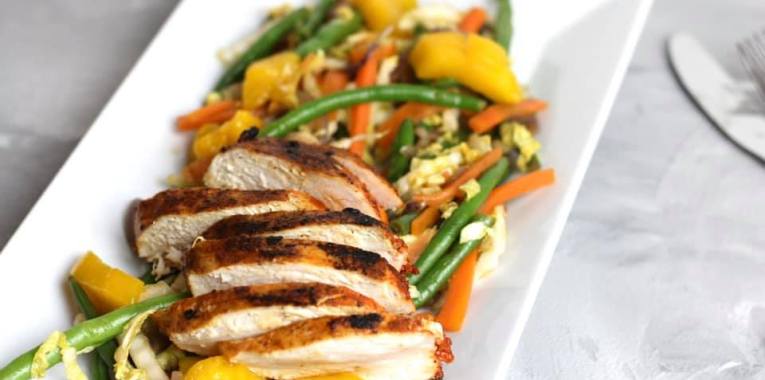 Fruchtig, salzig und etwas Würze verleiten diesem Gericht den nötigen Pfiff. Dieser lauwarme Salat ist einfach super. Ohne Huhn sogar vegetarisch und vegan.
