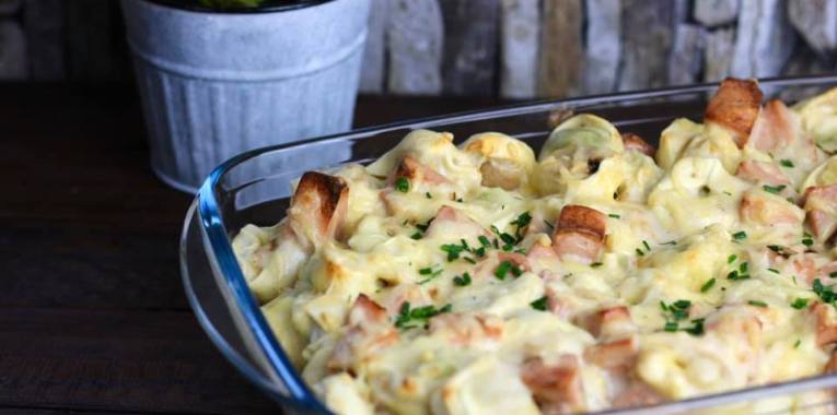 4. Tortellini, Schinkenwurst-Zwiebel-Mischung und Sauce miteinander vermengen und in eine Auflaufform geben, mit Käse bestreuen und ca. 15 Minuten backen.