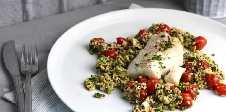 Frisch, leicht und schnell zubereitet. Wer keinen Fisch mag, nimmt Hühnchen oder lässt das Fleisch ganz weg.