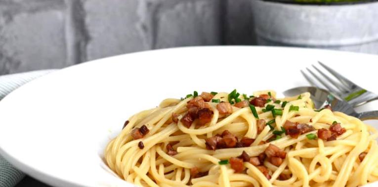 Richtig. Es ist wieder Zeit für ein Leibgericht. Heute eine klassische Carbonara, für die man echt kaum etwas benötigt. Ohne Schinken ist sie auch vegetarisch.
