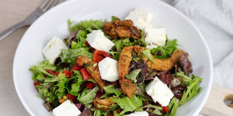 Die Mischung aus Salat und Fleisch mit Feta ist einfach super gewesen. Testet es mal aus. Da es schnell gehen soll, darf man auch mal auf eine Dressingmischung zurückgreifen. Man kann es auch selbst anrühren aus Öl, Wasser, Salz, Pfeffer, Zucker und einer Kräutermischung. Vegetarier lassen das Fleisch weg.