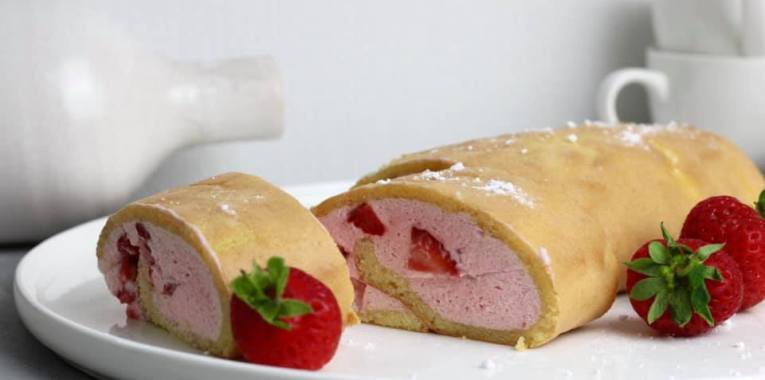 Leibgerichtfreitag und heute gibt es ein Dessert. So kurz vor Ende der Erdbeersaison musste sie noch her – die Erdbeerrolle. Man kann sie auch mit Himbeeren und Brombeeren machen.