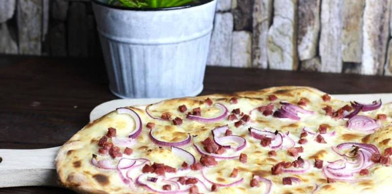 Leibgerichtfreitag ist heute und da gibt es dieses Mal den guten Flammkuchen. Wer absolut keine Lust auf Teigkneten hat, kauft einen fertigen 😉