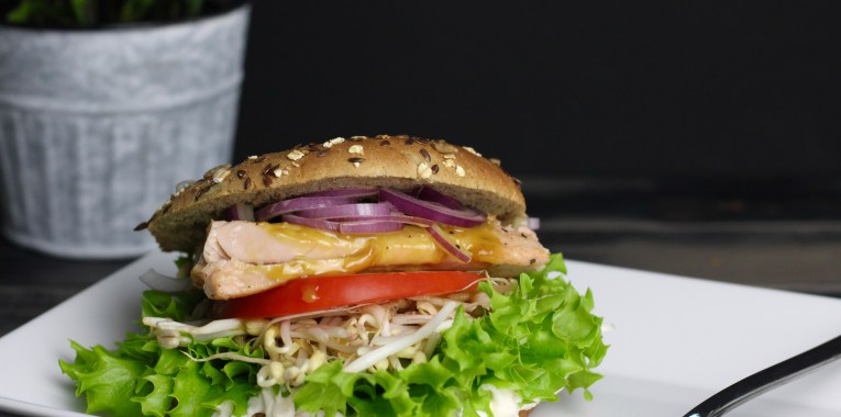 - Zuerst Creme auf das Brötchen, dann Salat, es folgen Mungobohnenkeimlinge und die Tomate. Danach setzt man den Lachs drauf und gibt die Honigsauce auf. Zwiebelringe und Deckel folgen zum Schluss.