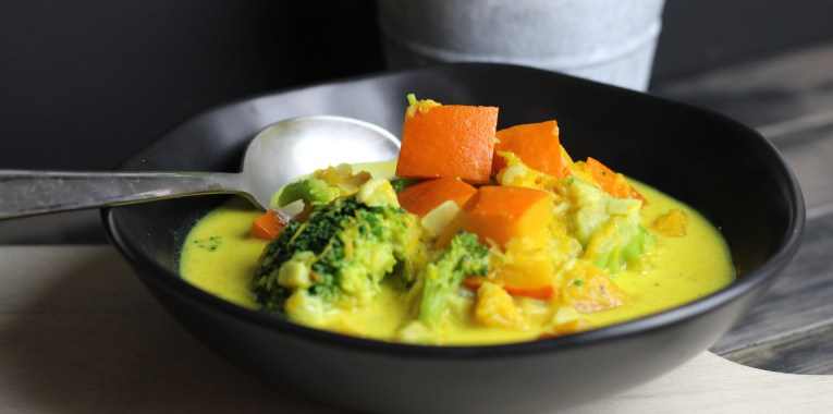 - Nach 2 weitere Minuten mit Curry bestäuben und dann die Kokosmilch und die Brühe angießen.