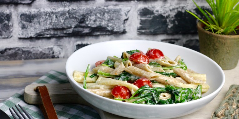 - Pasta abgießen und mit Spinat, Sauce und Tomaten vermengen.
