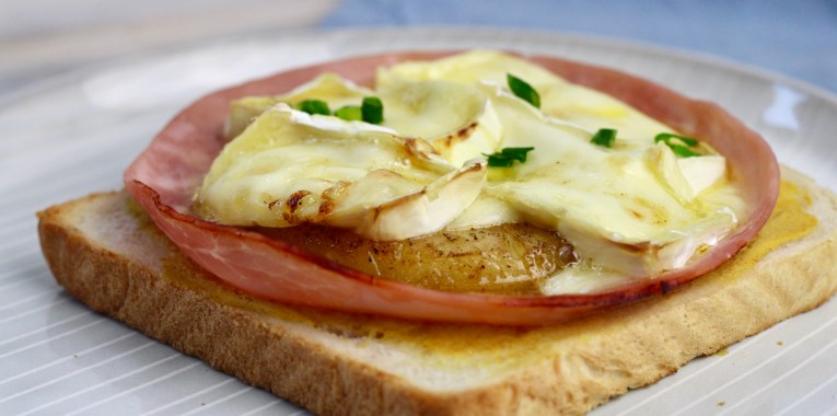 3. Parallel Toast mit Senf bestreichen, darauf den Schinken und dann die Ananas.