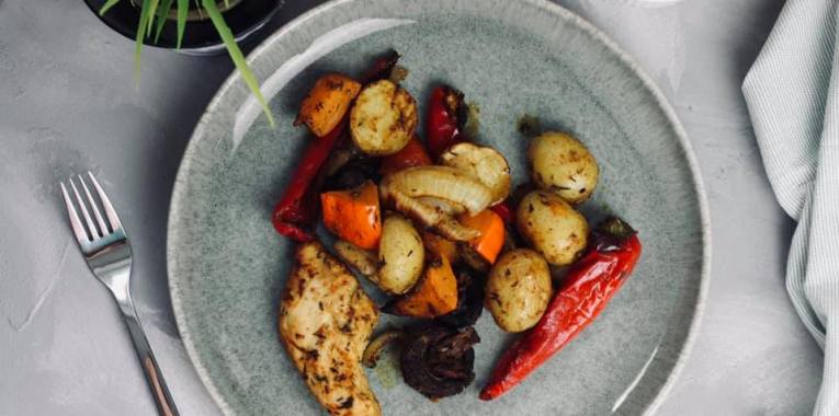 Ofengemüse ist ein Klassiker. Die Auswahl an Zutaten ist völlig flexibel und breit. Ich habe mir gedacht, da es noch Sommer ist, warum nicht einfach warme Farbe an Gemüse wählen und daraus ein Gericht zaubern. Als Protein habe ich Geflügel genommen. Kann man aber auch getrost weglassen.