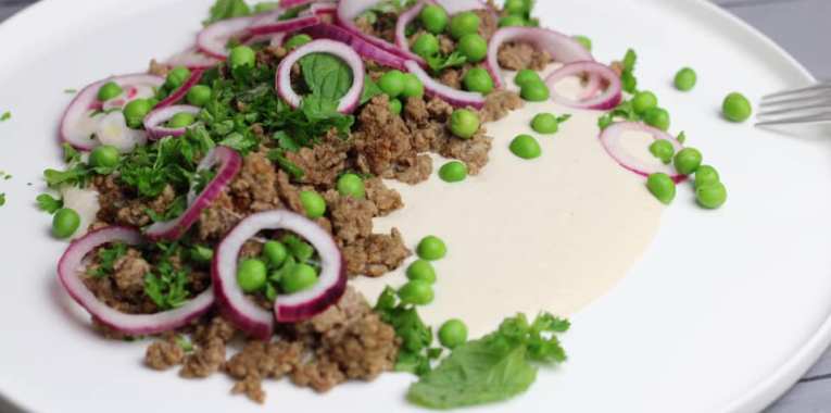 Würziges Hack an Bohnenhumus