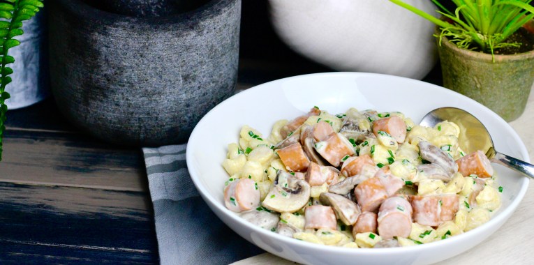 Die Mischung macht’s. Knöpfle, Pilze und Wiener Würstchen ergänzen sich hier blendend.