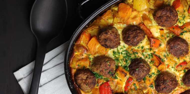 Ein ziemlich buntes Gericht, das sättigt und glücklich macht. Ohne Bällchen auch für Vegetarier ein Genuss.