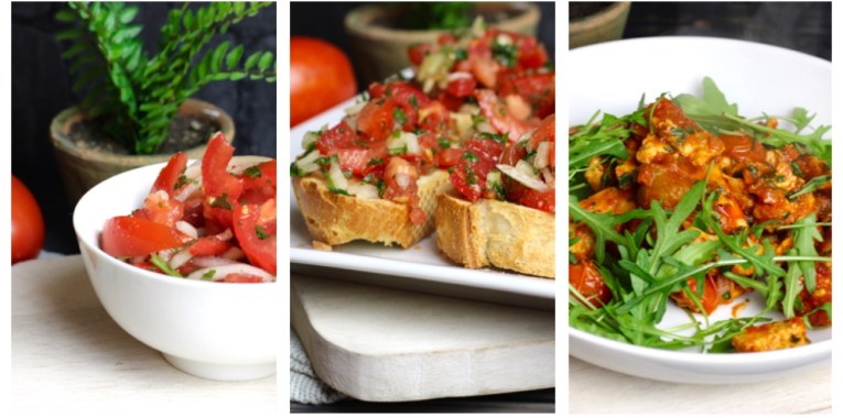 Hier mal eine neue Idee von mir. Ich suche eine Hauptzutate aus und diese wird in drei Gerichte integriert. Dieses Mal die Tomate. Die Angaben reichen auf alle Fälle immer für 2 Personen.