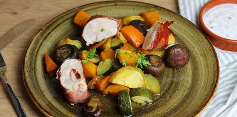 Ofengemüse geht in sämtlichen Variationen und ist schnell und einfach zubereitet. Hier zeige ich euch dazu ein Gericht mit ummantelter Hähnchenbrust.