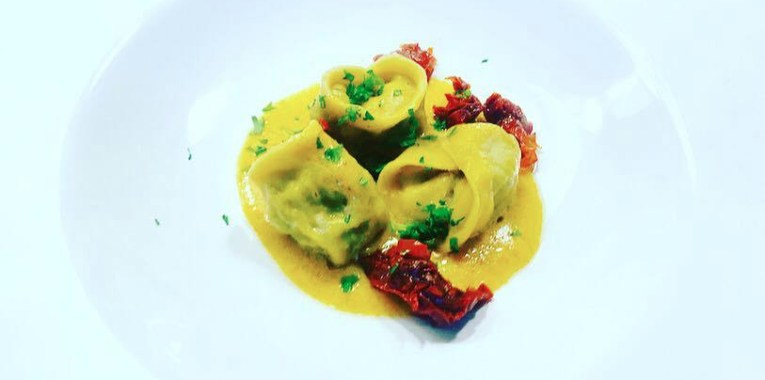 Tortellini mit Hack-Kräuter Füllung an Safransauce