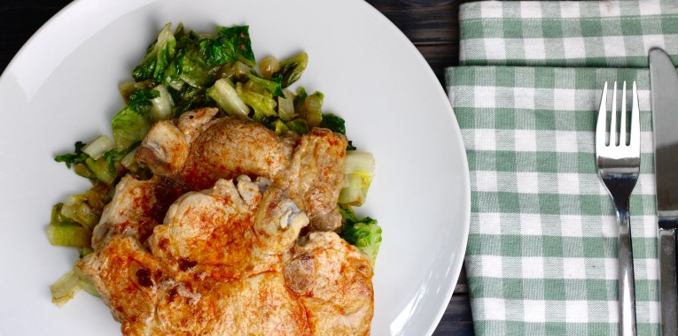 5. Salat mit Dressing vermengen und zusammen mit dem Zwiebel-Sahne-Hähnchen servieren.