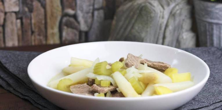 Spargelsuppe ist ein Klassiker, aber ich habe mir gedacht, warum nicht mal eine Brühe. Natürlich kann man das Fleisch einfach weglassen für Vegetarier.