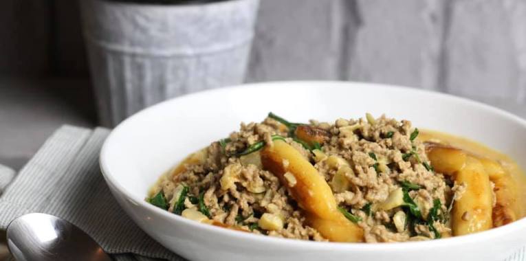 Senfige Schupfnudel-Hackpfanne