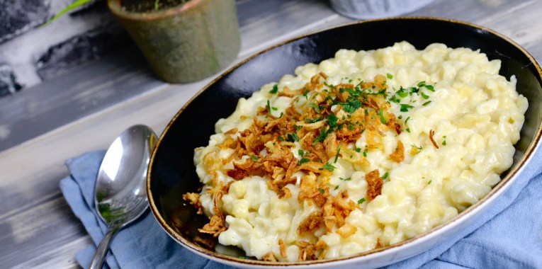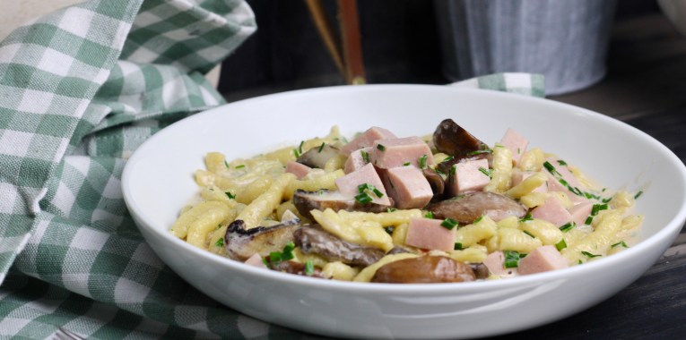 Leibgerichtfreitag ist wieder angesagt. Heute mit einem megaleckeren Rezept, das schnell gemacht ist. Notfalls kann man auch fertige Spätzle aus dem Kühlregal nehmen. Das Schaben ist mir noch nicht so gelungen., weshalb ein Sieb herhalten musste.