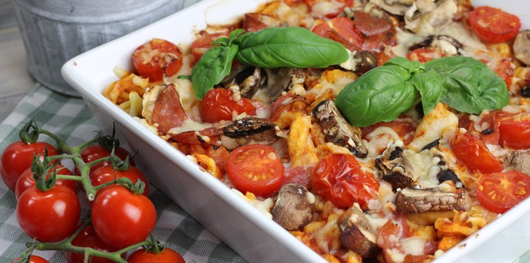 Statt nur mit Käse kann man diese Nudeln auch mal im Pzzastyle gestalten.