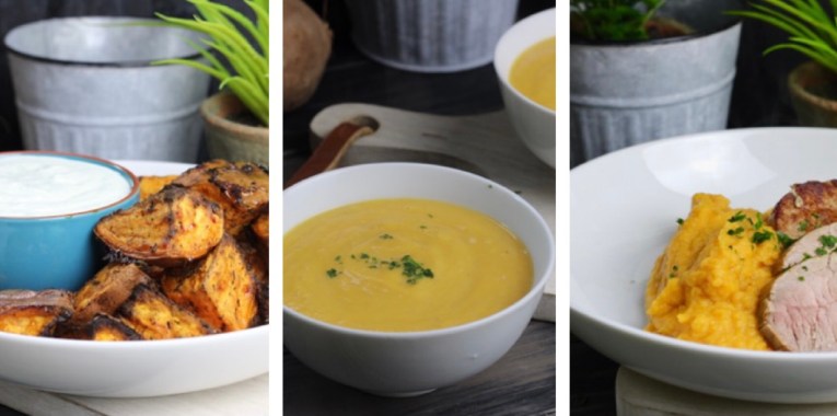 Wedges, Suppe und Pürée bilden das Trio dieses Mal. Die Süßkartoffel ist so vielseitig einsetzbar und schmeckt immer finde ich. Zu den Wedges nimmt man einen Dip nach Wahl, zum Pürée habe ich Schweinefilet angebraten und in Medaillons geschnitten. Da kann jeder selbst entscheiden, was er bevorzugt.