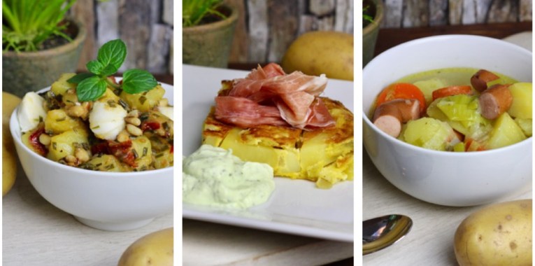 Dieses Mal ist die Knolle im Mittelpunkt der drei Gerichte, die man super parallel kochen kann. Aus 2,5kg Kartoffeln, kriegt man locker 4-6 Leute satt. Je nachdem, ob man einige Komponenten weglässt, kann man die Gerichte teilweise sogar vegan gestalten.